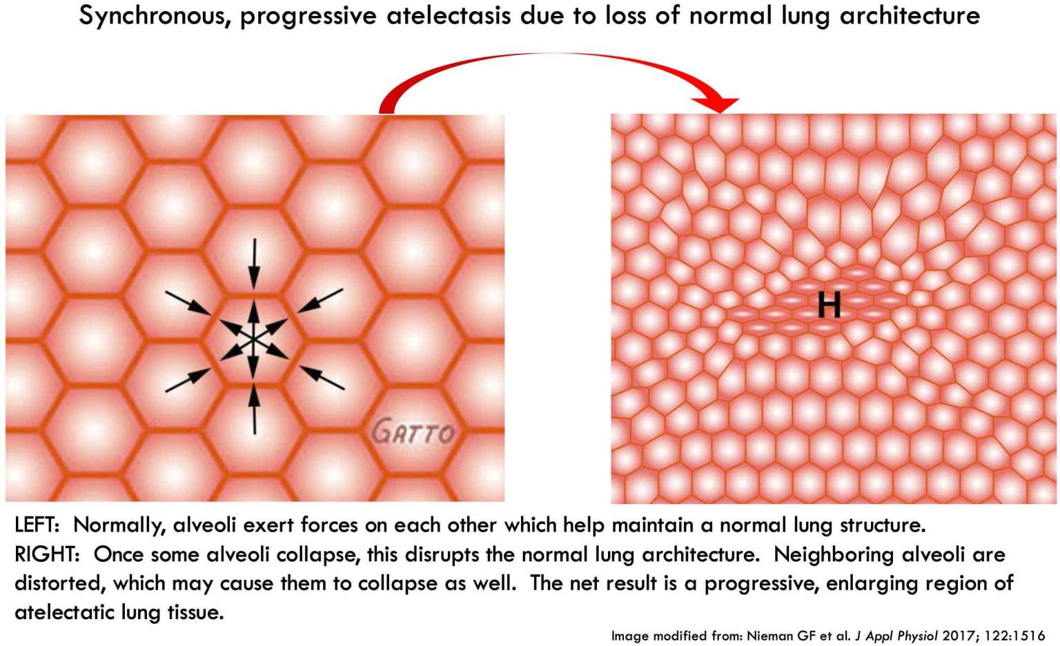 Some patients might have progressive alveolar collapse, as shown above. Alveoli start collapsing, which distorts the lung architecture and promotes collapse of neighboring alveoli. If left unchecked, this may lead to progressive deterioration which eventually requires intubation.