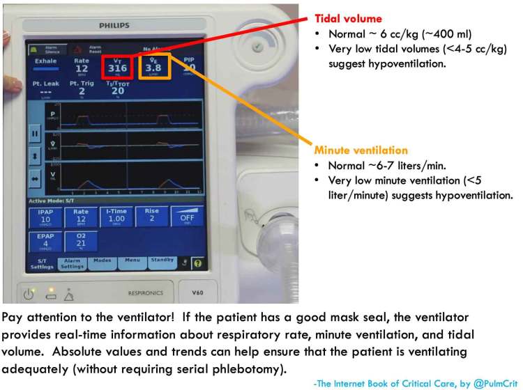 - Ventilation efficacy (tidal volume & minute ventilation on the CPAP device, perhaps intermittent VBG/ABG as clinically warranted)